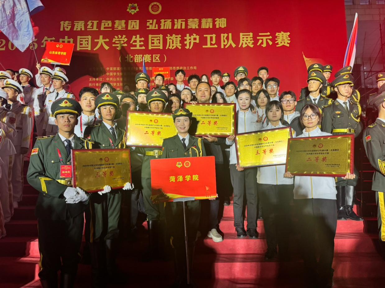近日,由中国学生体育联合会主办的2025年中国大学生国旗护卫队展示赛(北部赛区)在临沂大学举行。菏泽学院大学生国旗护卫队凭借过硬素质和出色表现,从北部赛区29支参赛队伍中脱颖而出,荣获升旗展示混编本科组二等奖,女子组展示、队列二等奖,以及男子组展示、队列三等奖的优异成绩。男子组与女子组凭借稳定发挥,双双成功晋级全国总决赛。