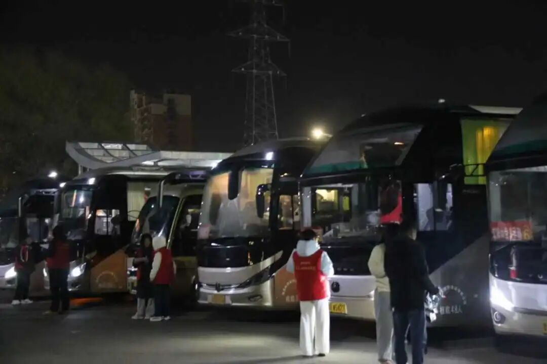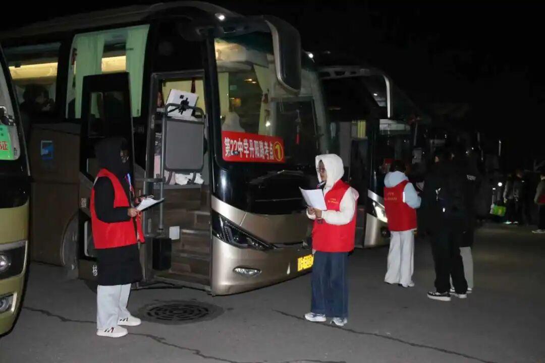 清晨6时,菏泽学院南门处数辆客车整齐排列,车身醒目地贴着考场地点标识,车内空调早已提前开启,暖意融融。司机师傅正仔细检查着每一处细节,从座椅安全带的牢固性到应急设备的完备性,确保行程万无一失。随后,考生们陆续抵达,身着红色马甲的志愿者迅速投入工作。他们手持签到表,耐心引导考生有序登车,在志愿者的细致安排下,考生们分批次走向对应车辆,现场秩序井然。