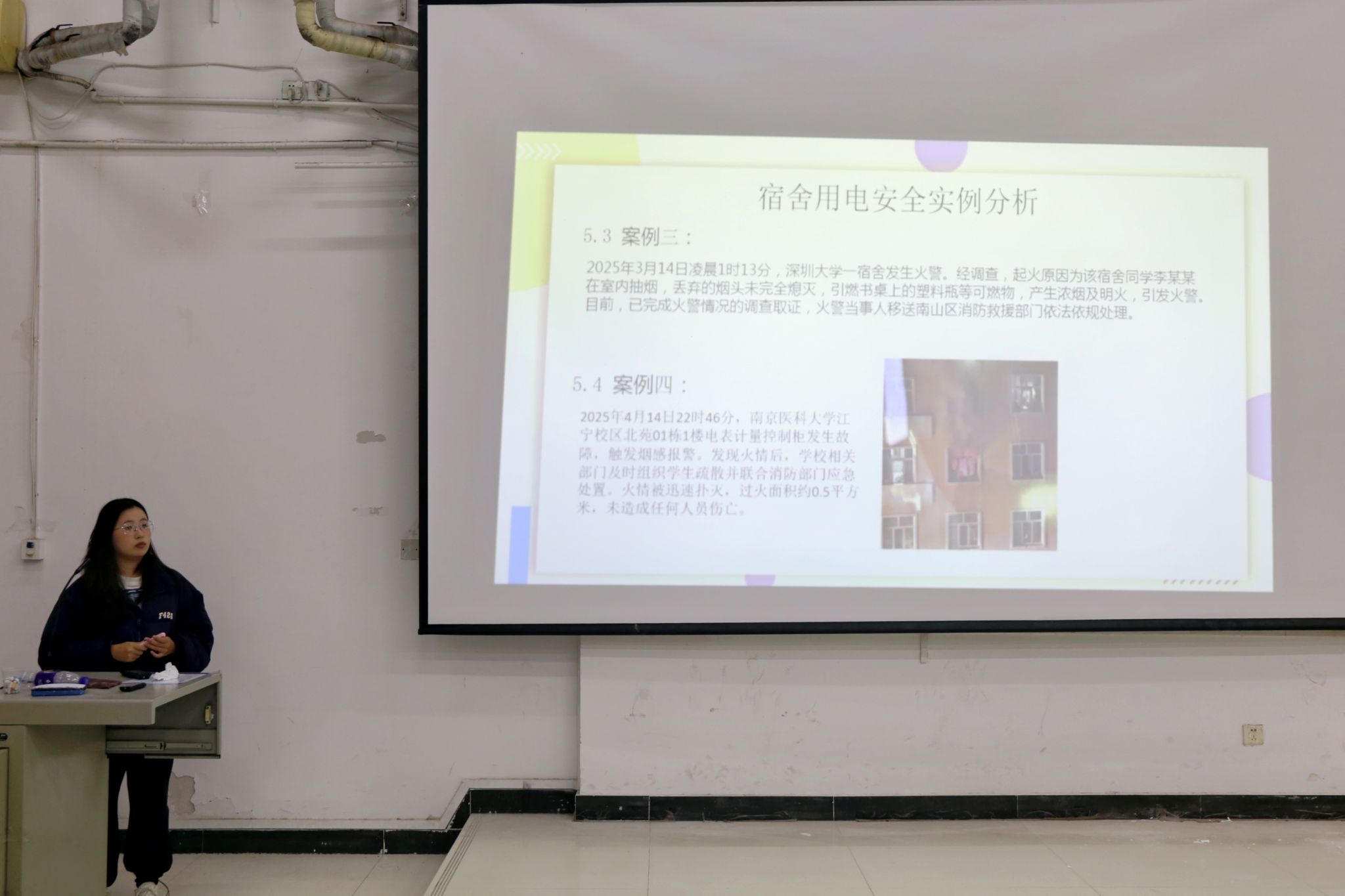 宣讲员结合高校宿舍用电安全典型案例,详细讲解了宿舍安全用电的规范要求,阐述了违规用电的潜在危害,明确强调宿舍内严禁使用卷发棒、电磁炉、烧水壶等大功率电器。同时,提醒同学们务必自觉遵守学校规章制度,强化安全责任意识,养成人走断电的良好习惯,并熟练掌握突发情况的应急处理措施。