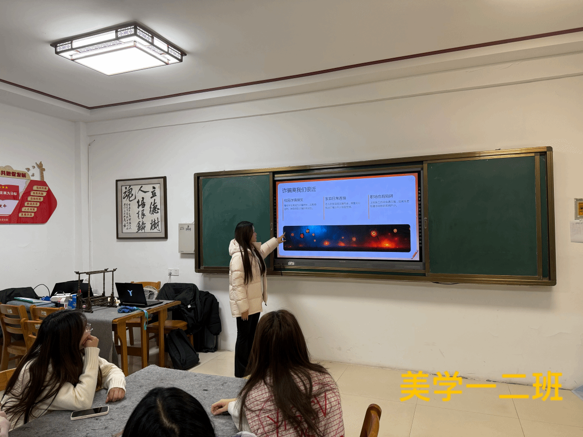 各班团支书们向同学们系统解读了电信网络诈骗的定义与“远程非接触、手段迭代快、分工严密”等核心特征,重点聚焦美术设计专业学生高频接触的典型骗局,结合案例拆解与话术对比,揭露诈骗分子利用学生兼职需求和专业认知盲区设下的陷阱。同时,通过展示“冒充客服退款”“虚假投资理财”“校园贷变种”等高校共性诈骗类型,补充讲解了一些通用防骗知识。