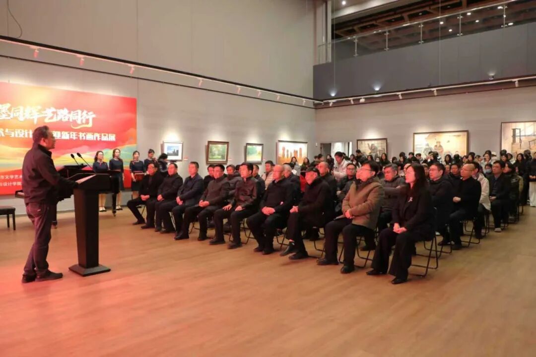 田智祥代表学校党委致辞,他指出,本次展览是学校文化育人、美术与设计学院美育建设的生动实践,勉励师生校友以笔墨践初心,为校地发展与文化强国建设添彩。