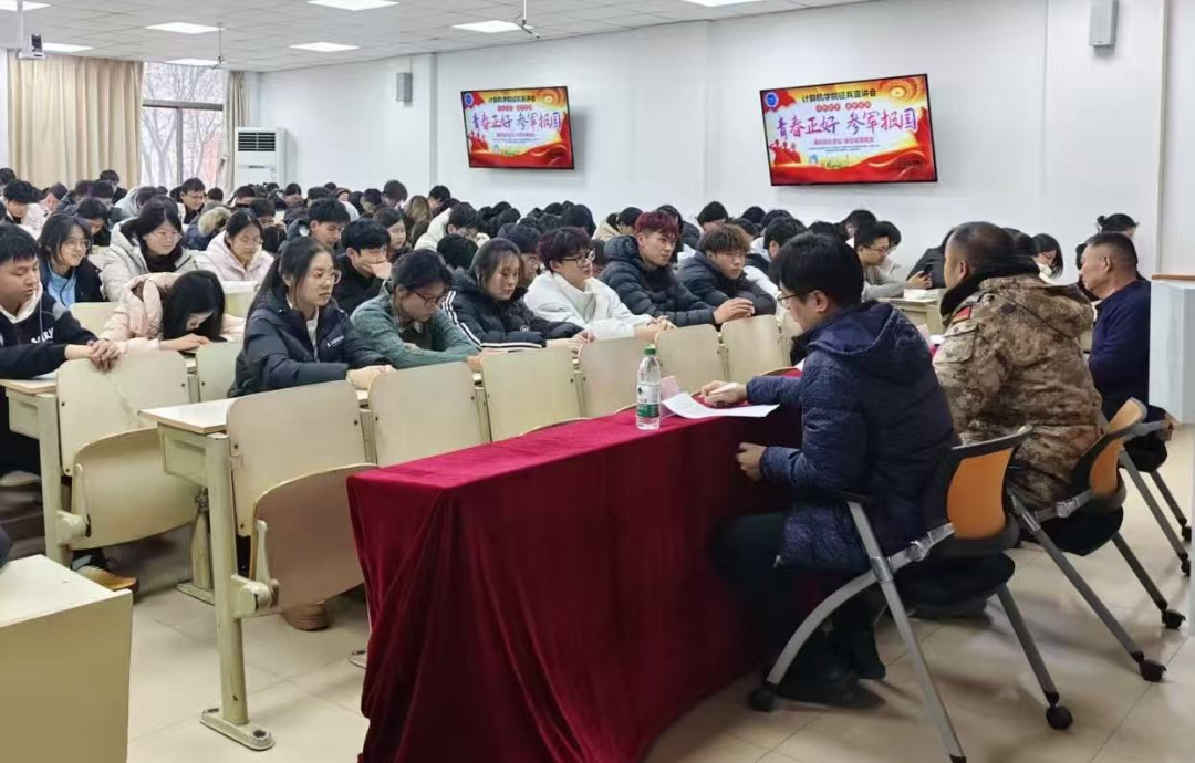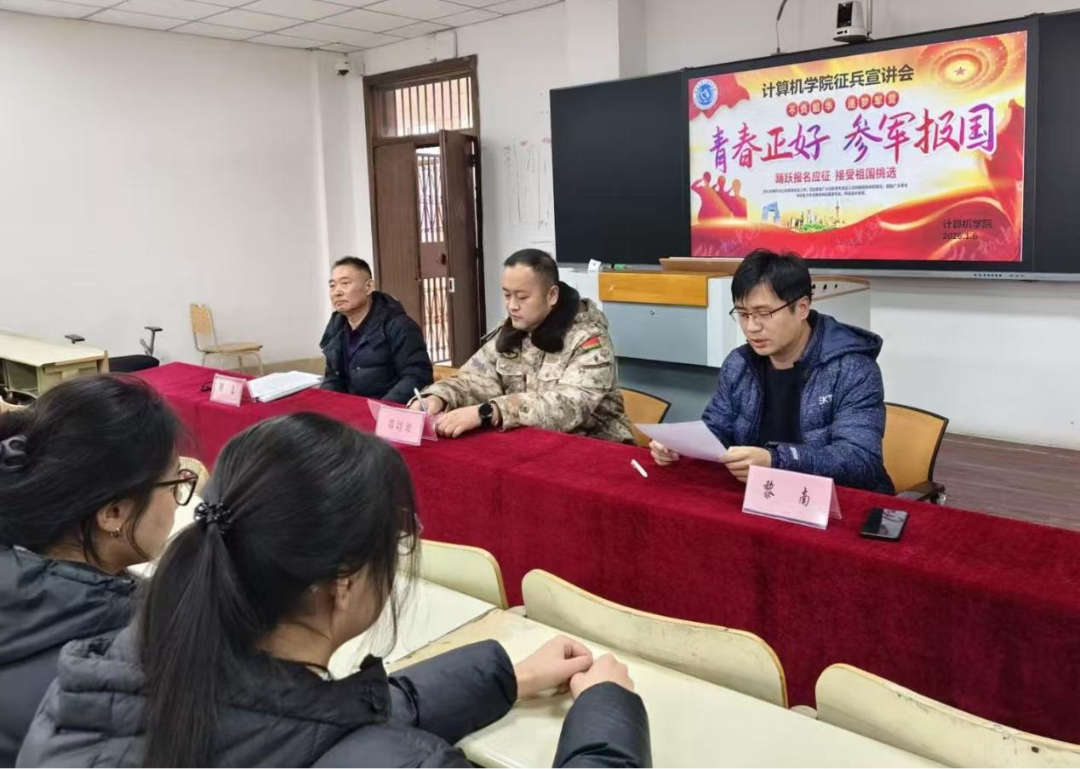 随后,郭泉老师精准对接学生关切,为学子拆解“为何参军、参军何获、如何参军”三大关键问题。他结合国防现代化建设需求,阐明了计算机专业青年在军事信息系统运维、网络安全保障等领域的重要使命;细致梳理政策红利,明确学费补偿、升学加分、就业优先等核心福利,并详细讲解了2026年征兵时间节点、报名条件与报名流程,让学生对参军事宜心中有数。