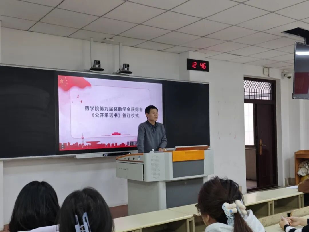 为深入贯彻落实资助育人工作要求,切实加强获奖受助学生的教育管理,3月17日中午,药学院在9号楼402教室举行第九届奖助学金获得者《公开承诺书》签订仪式。药学院辅导员张圣仓主持仪式,2024-2025学年国家和省政府奖学金、励志奖学金,2025-2026学年国家助学金等获奖受助学生参加活动。