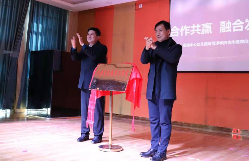 2021年11月23日上午,我校教师教育学院与西城中心幼儿园合作创办的“儿童艺术教育工作室”揭牌仪式在西城中心幼儿园正式举行。牡丹区教育工委副书记李传宇、各幼儿园园长,教师教育学院党委书记段永华,常务副院长陈光磊,副院长韩丕国等参加了本次揭牌仪式。