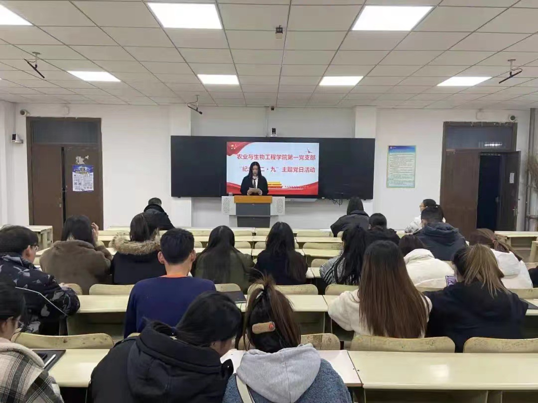 为纪念“一二·九”运动85周年,引导同学们缅怀昨日,反思今日,畅想明日,不忘国耻,勇担使命。12月3日,农业与生物工程学院第一党支部于9号楼204教室开展“纪念一二·九”主题党日活动,参与本次活动的有第一党支部书记黄燕丽、辅导员郭锐颖以及第一党支部全体成员。