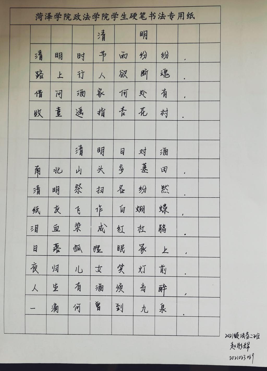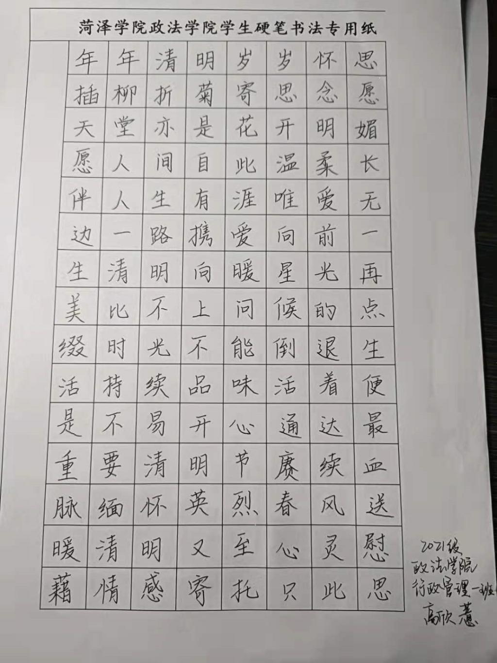 2022年4月1日,政法学院举办了以“鲜花祭故人,春雨献哀思”为主题的书法作品征集活动,主办方为共青团菏泽学院政法学院委员会,承办方为菏泽学院文法协会。