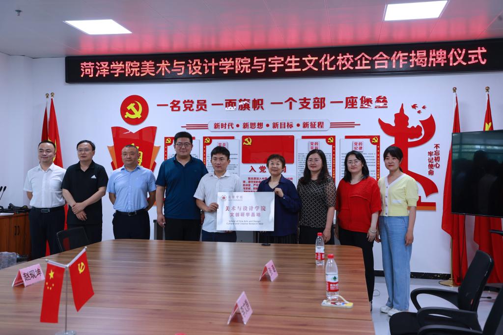 在本次走访中,菏泽学院美术与设计学院与山东宇生文化股份有限公司举行“文创研学基地”挂牌仪式。院领导与企业负责人座谈交流,周倩院长指出,美术与设计学院与山东宇生文化股份有限公司是老朋友,双方已经合作交流十几年,并在非遗研究方面进行多次合作。山东宇生文化股份有限公司董事长王英杰强调,公司非常珍惜与美术与设计学院合作交流的机会,并对下一步合作提出了相应的思路。本次走访,双方进一步达成深度合作意向,将在人才培养、科学研究等方面加强合作,推动学院和企业共同发展。