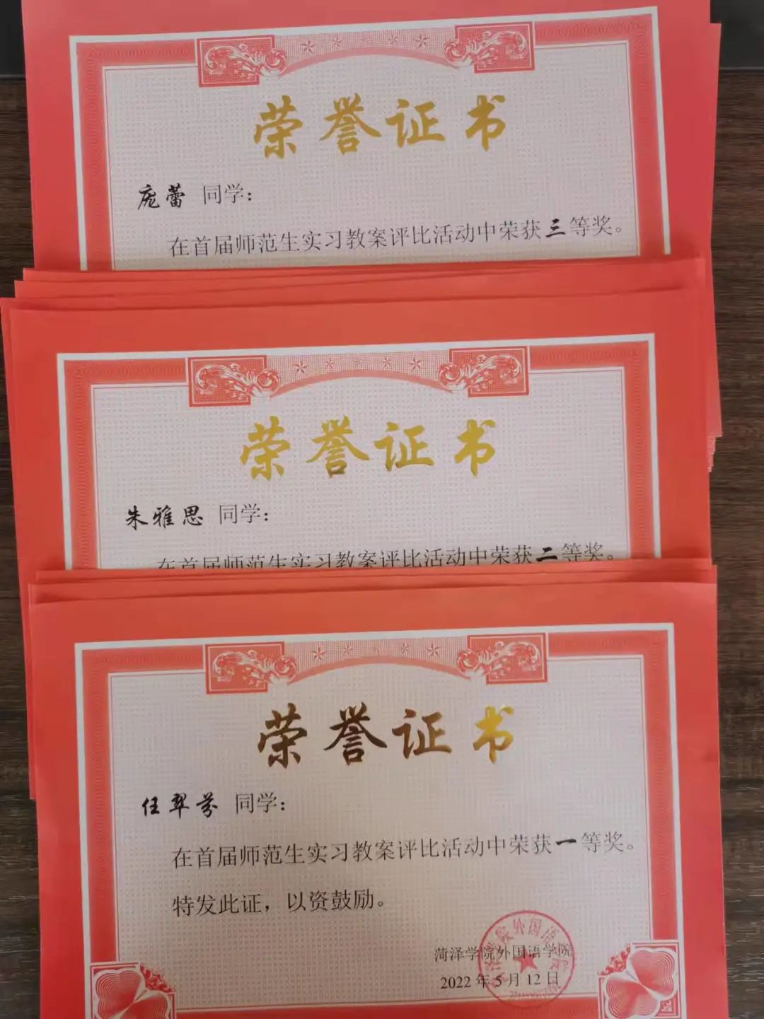 本次评比注重实习生课堂教学活动设计的科学性,强调授课方法的多样性。2019级英语教育三班郑凯的教案字迹干净整洁,教学环节细致丰富且相辅相成,课堂能充分发挥学生为主体、教师为主导的作用。2019级英语教育一班任翠芬的教案贴近学生生活实际,体现了理论与实际教学的结合,教案中穿插精致的图片更能给人以视觉上的美感。本次活动设置20%的获奖比例,共有31名同学获得荣誉证书。经过综合评分,郑凯、任翠芬、曹连翠等5名同学荣获一等奖;朱雅思、李昕、赵蕾等10名同学荣获二等奖;蒋梦欣、张敏、王鑫、张迪、庞蕾、范雨晨等16名同学荣获三等奖。